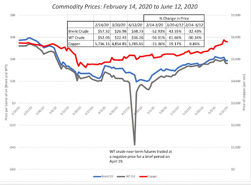 Default spreads followed the path of equities, widening significantly between February 14 and March 20, and falling back by June 12, albeit to levels higher then on February 14. The fear about how the pandemic would slow economic growth also affected commodity prices, and I chart the path of copper and oil, two commodities sensitive to global economic growth below: